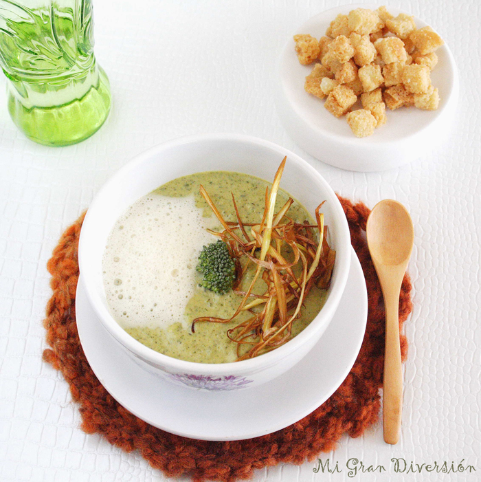 Ponemos a cocer los ramilletes de brócoli junto con el calabacín troceado (yo le dejo la piel) en una cacerola con la leche evaporada y un chorro de agua.** Thermomix => 20 minutos/100º/vel 1.Escurrimos las verduras y reservamos el caldo.Laminamos los dientes de ajo y sofreímos en una sartén con aceite de oliva. Agregamos las verduras, tapamos y cocinamos a fuego medio durante 10 minutos. Trituramos y añadimos la cantidad de caldo necesario hasta conseguir la textura deseada.Crujiente de puerro: cortamos el puerro en juliana (tiras alargadas y muy finas) y las freímos en una sartén con abundante aceite hasta que estén crujientes. Reservamos en papel absorbente.Aire de queso: derretimos el queso troceado en la leche evaporada que nos ha quedado de cocer las verduras. Una vez derretido, colamos y espumamos con la batidora de mano o en la thermomix, con la mariposa puesta y sin programar tiempo a vel 4.
