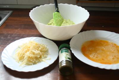 Añadir a la mezcla el queso rallado, los huevos batidos y el eneldo.