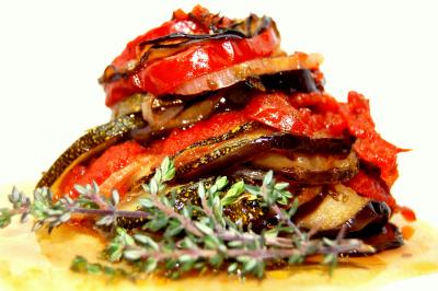 En una bandeja de horno untada con aceite, colocais las verduras montadas de forma alterna, formando filas (berenjena, tomate, calabacín, cebolla, berenjena, tomate, etc...)