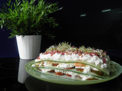 Bueno ahora viene lo entretenido en una fuente vamos colocando las láminas de pepino una al lado de la otra, encima colocamos los tomatitos en rodajas y les echamos un poco de sal y aceite de oliva virgen, ahora el requesón cubriéndolo todo y luego los langostinos troceados.