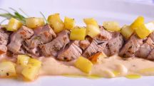 Capítulo 13: Solomillo de cerdo con texturas de manzana y Coca de tomates confitados, queso curado al romero y rúcula