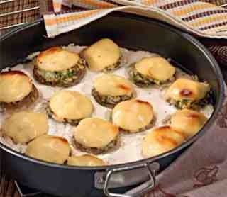 Положить шляпки шампиньонов в смазанную маслом форму. Наполнить их начинкой, сверху накрыть кружками сыра.