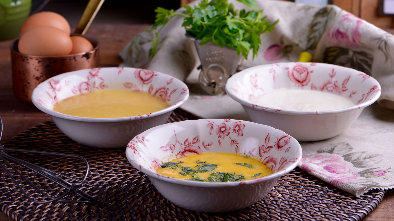 Retiramos del fuego y agregamos a la cazuela 3 yemas de huevo. Mezclamos con cuidado con una varilla y devolvemos la cazuela al fuego, pero esta vez, a baja intensidad. Al poner el fuego muy lento evitamos que las yemas de los huevos coagulen y se transformen en tortilla.