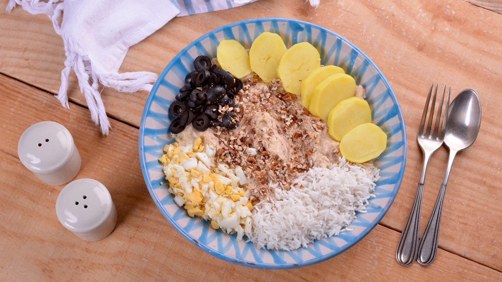 Ají de gallina con patatas, huevo y aceitunas