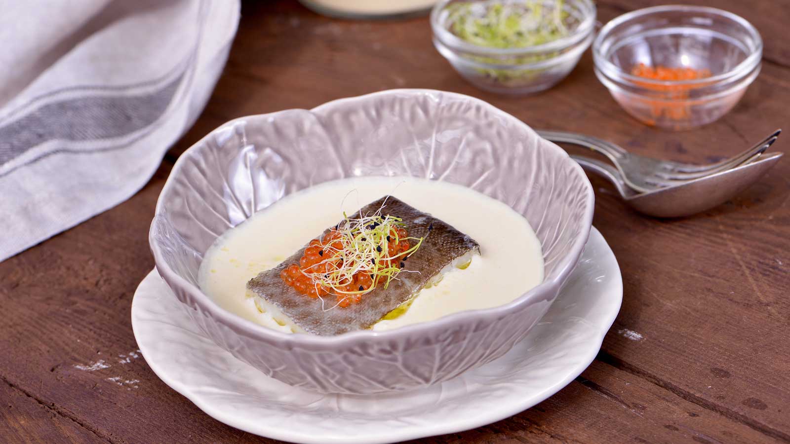 Ponemos un taco de bacalao en el centro de un plato hondo. Llenamos el plato de ajoblanco con ayuda de una jarra o un cucharón. Sobre el taco de bacalao decoramos con una cucharadita de huevas y encima unos brotes de ajo.