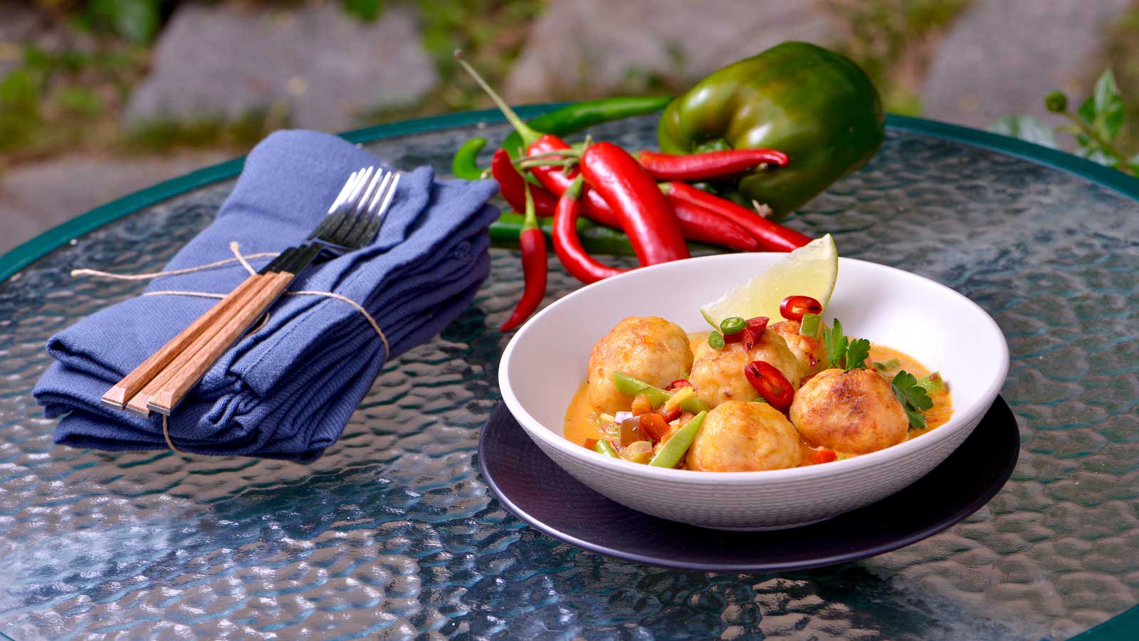 Por último, añadimos la salsa de pescado, el sambal oelek, la leche de coco y las judías verdes y cocinamos hasta que hierva. Ponemos entonces las albóndigas y dejamos cocer 10 minutos hasta que las albóndigas estén blandas. Rectificamos de sal y pimienta.