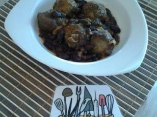 •En una cazuela se colocan las albóndigas, se echa un cazo del agua de la cocción de las alubias, o hasta que las albóndigas queden cubiertas y se ponen a hervir. Cuando esté ya cociendo, se pasan los frijoles y se terminan de cocer con las albóndigas, por espacio de 20 minutos.