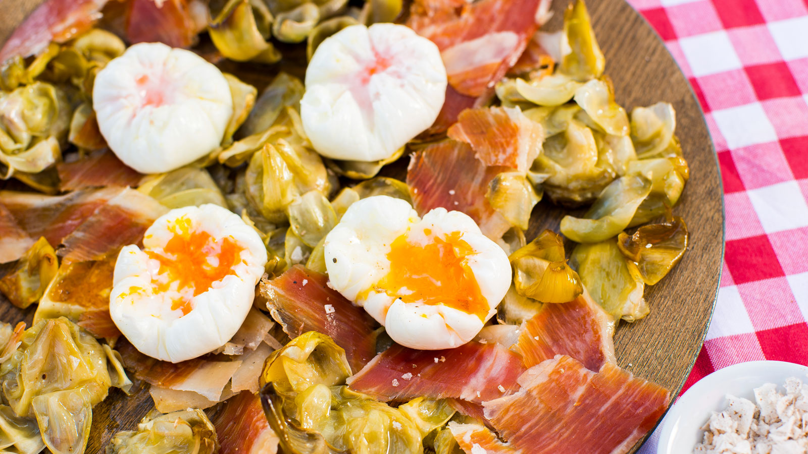 Alcachofas confitadas con huevo pochado, jamón y sal trufada