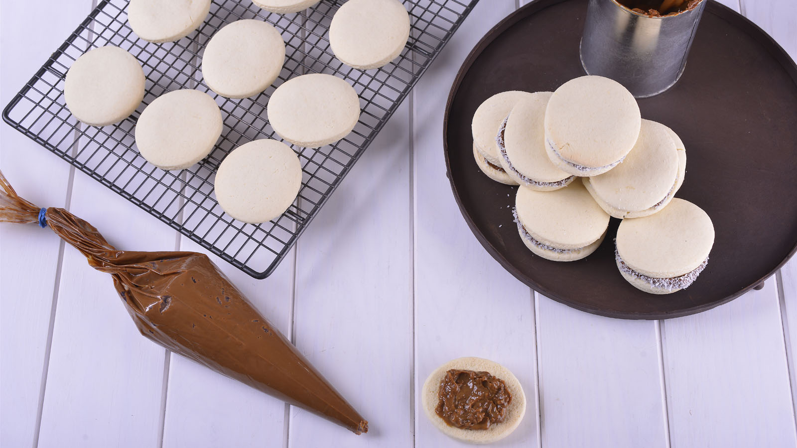 Finalmente los rellenamos con crema de chocolate y avellanas y tapamos con otro base de alfajor. Pasamos los bordes por coco rallado.