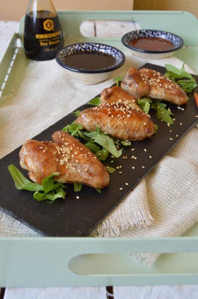 - 8 alitas y muslos de pollo 6 chorritos de ketchup 3 cucharadas de vinagre de módena 3 cucharadas de salsa de soja 2 cucharadas de polvo de cinco especias chino 2 cucharadas de miel Tomillo 1 diente de ajo Sal Pimienta Aceite de girasol