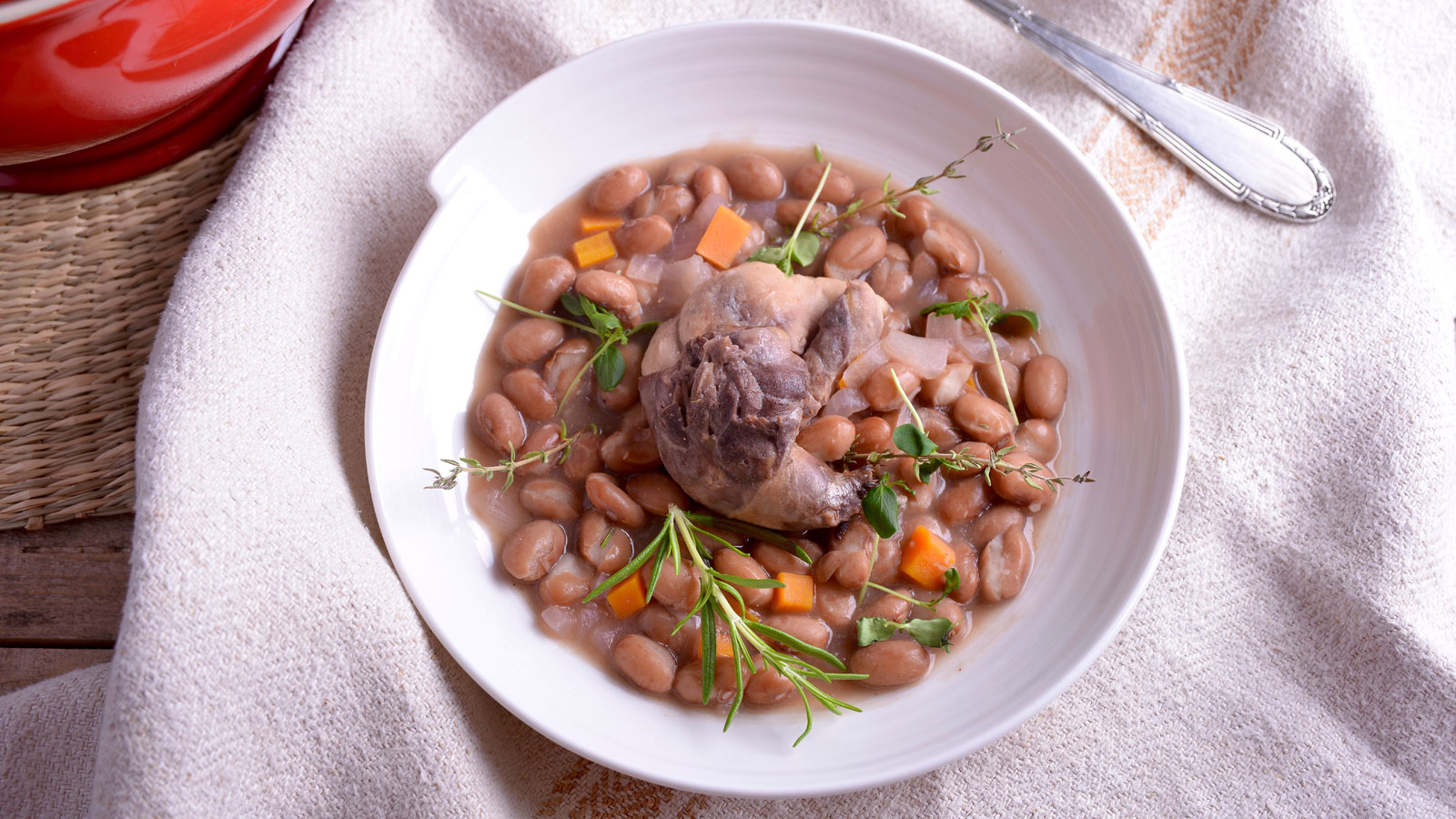 Cuando la perdiz se haya estofado, incorporamos a la olla las alubias y su caldo. Damos un último hervor hasta conseguir una salsa suave.