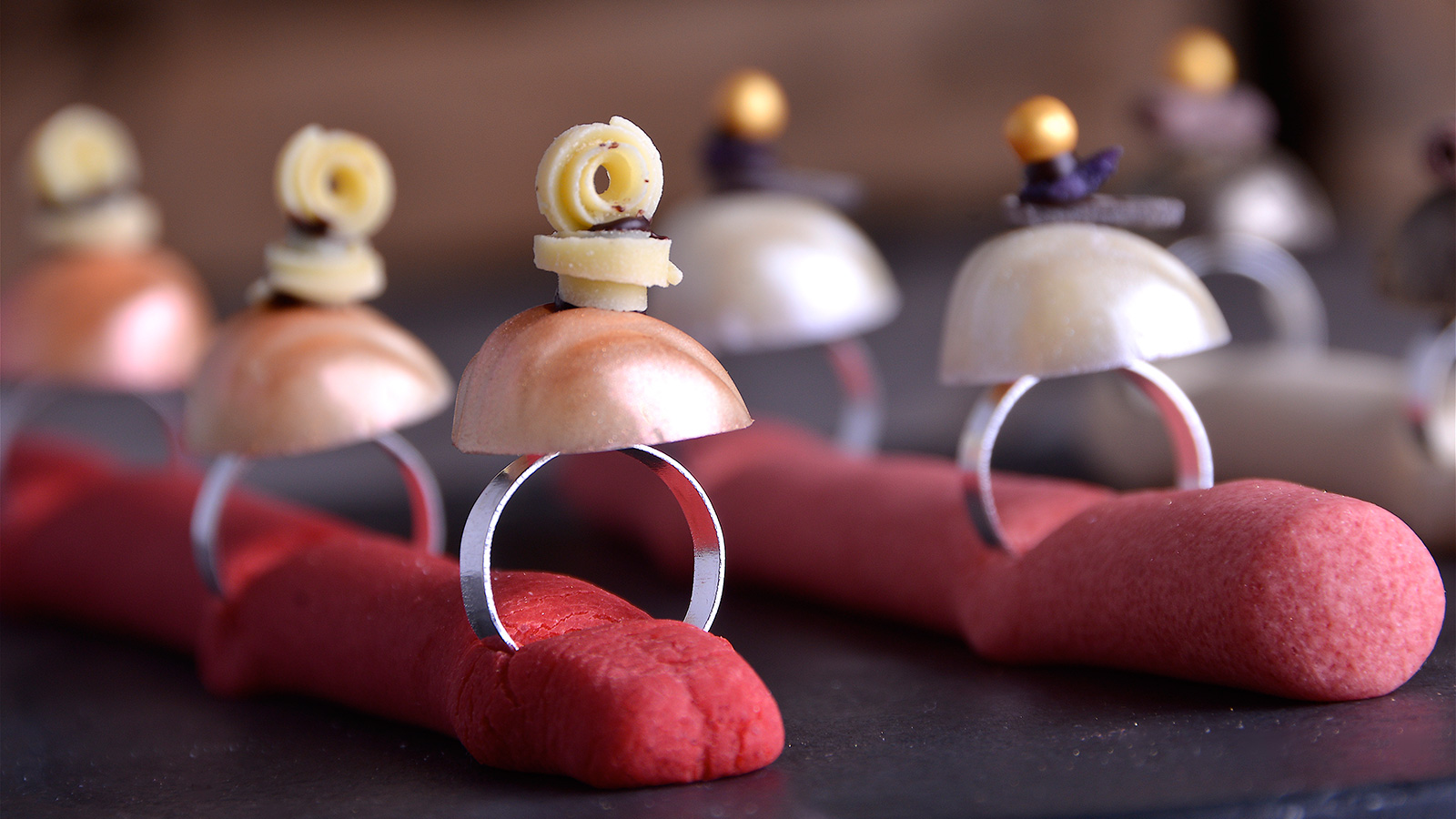 Seguidamente, en el soporte para anillo colocamos un punto de chocolate negro y pegamos los botones de chocolate con la ayuda de unas pinzas. Dejamos secar.