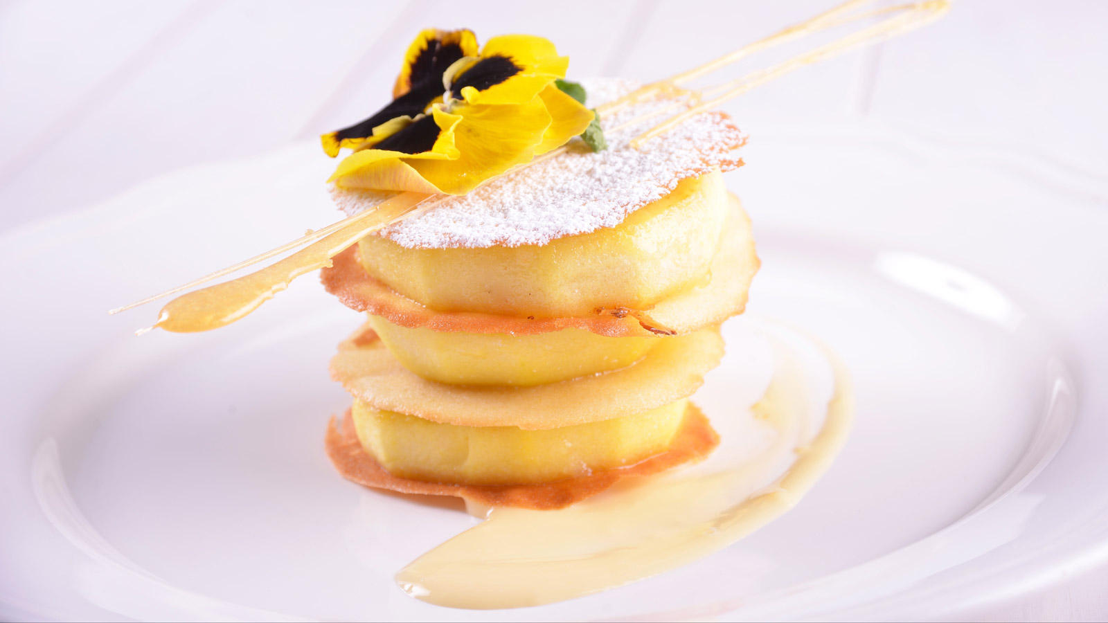 Emplatamos pintando una lágrima de crema inglesa en la base del plato. Colocamos la torre de tarta de manzana por encima y terminamos coronando con las figuras de hilos de caramelo que hemos preparado. Para dar el toque final, podemos adornar la tarta con una flor comestible para darle un toque más colorido al plato.