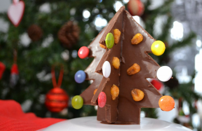 Sobre el soporte que vayamos a utilizar (puede ser un plato pequeño o similar) ponemos una cucharadita de chocolate derretido, encajamos las dos piezas de chocolate y las apoyamos sobre el chocolate derretido. Esperamos a que el chocolate se enfríe y el árbol quede estable.