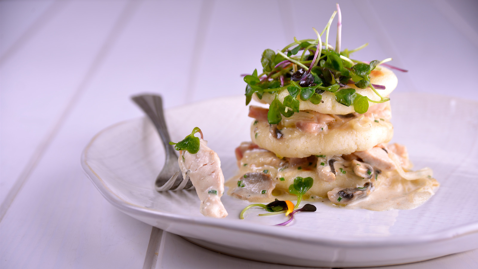 Cuando esté dorada agregamos el pollo, los champiñones y el jamón york y cocinamos unos 10 minutos aproximadamente. Pasado el tiempo añadimos la nata, el cebollino picado, salpimentamos y cocinamos unos minutos.