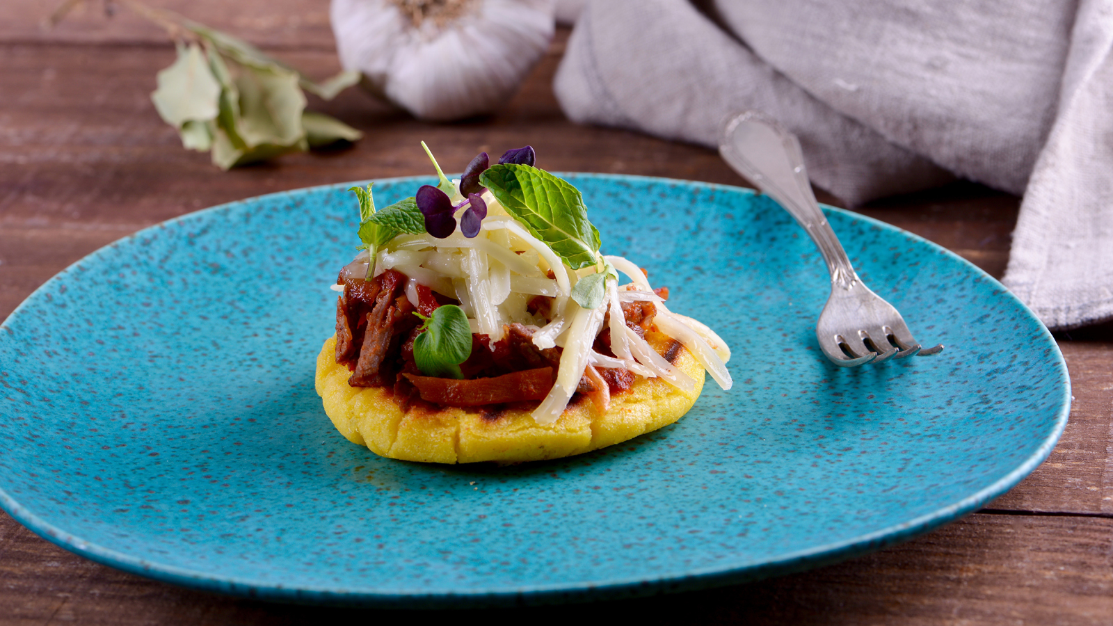 Servimos estas arepas, colocamos encima el sofrito de carne y terminamos con queso rallado, brotes y hierbabuena por encima.