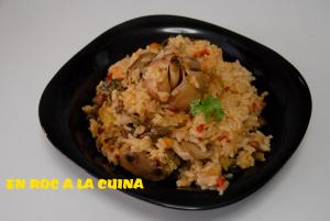 BARREJAR TOT , CONDIMENTAR AMB LA SAL + PEBRE + CAIENA , REGAR AMB EL WHISKY , DEIXAR REDUIR, DESPRÈS I POSAREM EL TOMÀQUET FREGIT I L´ARRÒS, DEIXAR COURE TOT JUNT UNS 5 MINUTS, PASSAT AQUEST TEMPS I POSAREM L´AIGUA QUE TINDREM CALENTA I COURE 20 MINUTS.