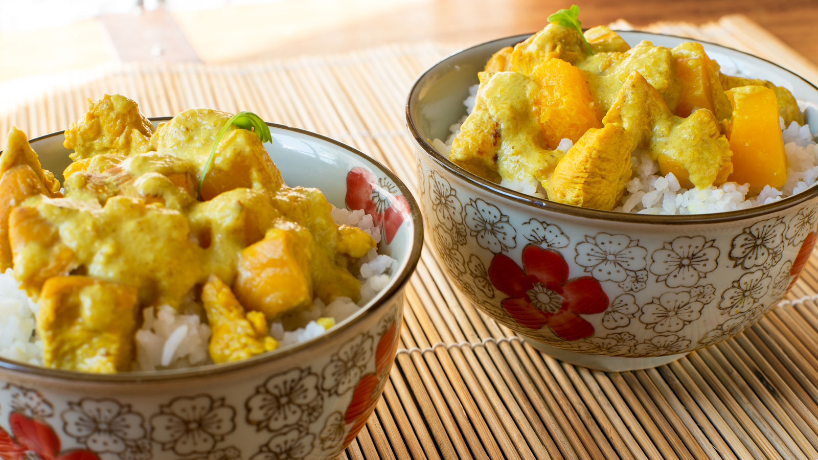 En un bol emplatamos el arroz blanco. Completamos el plato con un Curry de pollo por encima.
