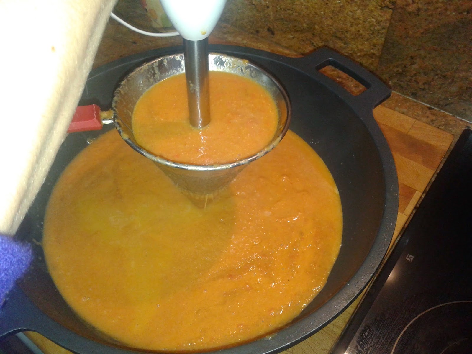 Una vez terminado el sofrito, pondremos al fuego una paellera alta y añadiremos el sofrito pasado por el chino. También iremos echando el caldo de pescado. La proporción es que por cada tacita de arroz eches 4 tacitas de caldo. Pero es bueno que tengas a mano el caldo por si vieses que has de añadir más.