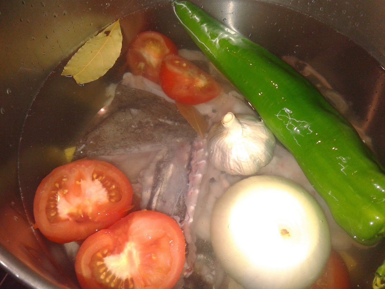 Empezaremos preparando el caldo de pescado. Pondremos en una olla todo en crudo, la cabeza de rape, la cabeza y espinas de merluza, 2 o 3 tomates abiertos por la mitad, 1 cebolla abierta por la mitad, 1 pimiento verde, 1 hoja de laurel, cubrimos bien de agua, echamos un chorrito de aceite de oliva y cocemos 20 minutos.