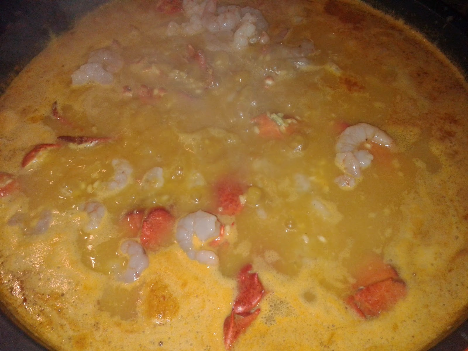 Ponemos el caldo con el sofrito a hervir y en ese momento echamos los bogavantes cortados en trozos. Cuando la carne del bogavante se pone de color blanco echaremos los gambones pelados y el arroz. Cocemos durante 20 minutos, los 10 primeros a fuego medio alto y el resto a fuego medio bajo.