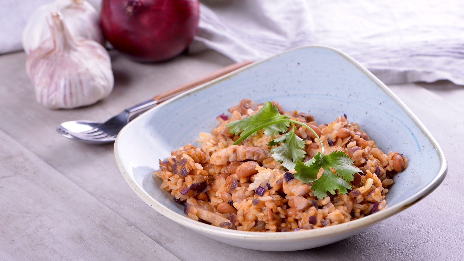 Arroz con frijoles y cebolla morada
