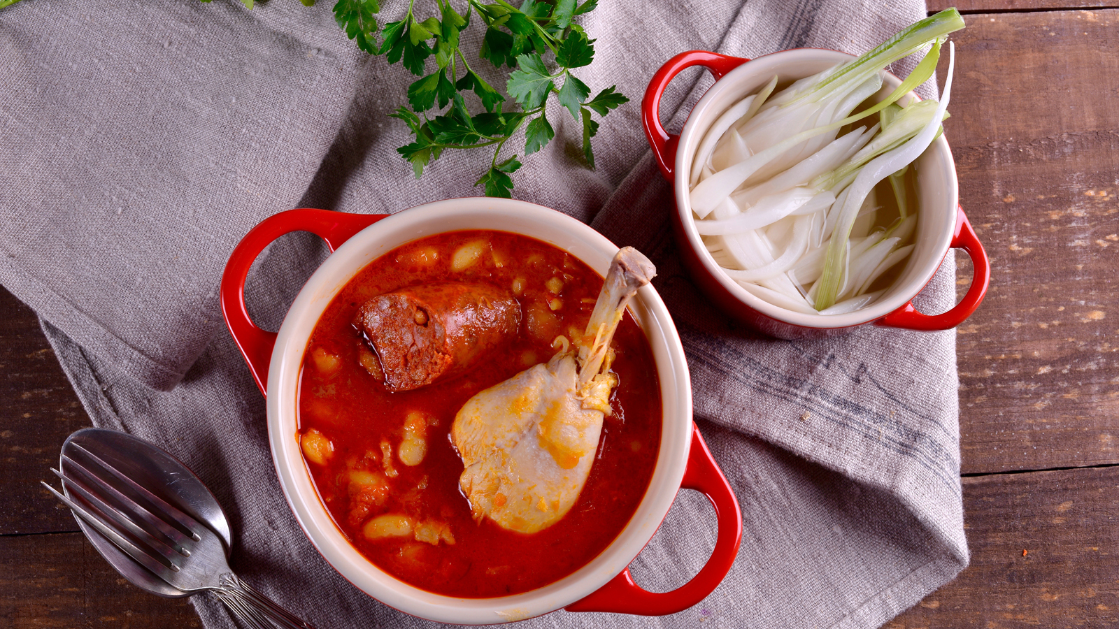 Ponemos una cazuela al fuego con las judías, el chorizo, el pollo y el caldo y cocinamos 90 minutos a fuego lento.