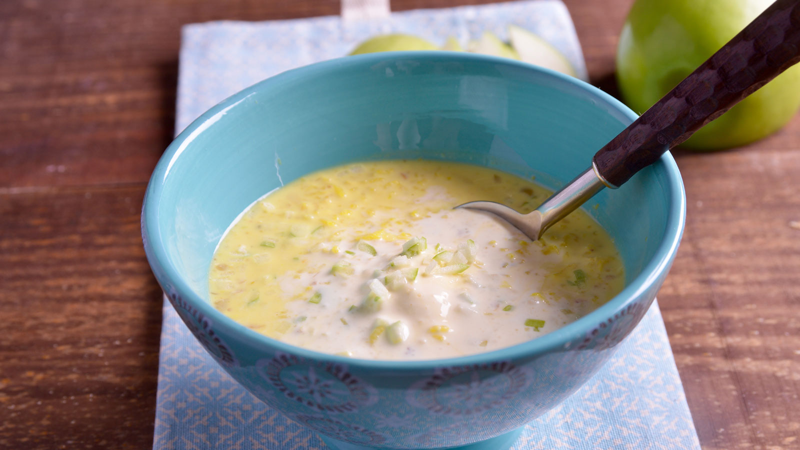 Cuando se haya enfriado, retiramos el tazón de la nevera y lo servimos acompañado de una bola de helado de vainilla y unos gajos de manzana.