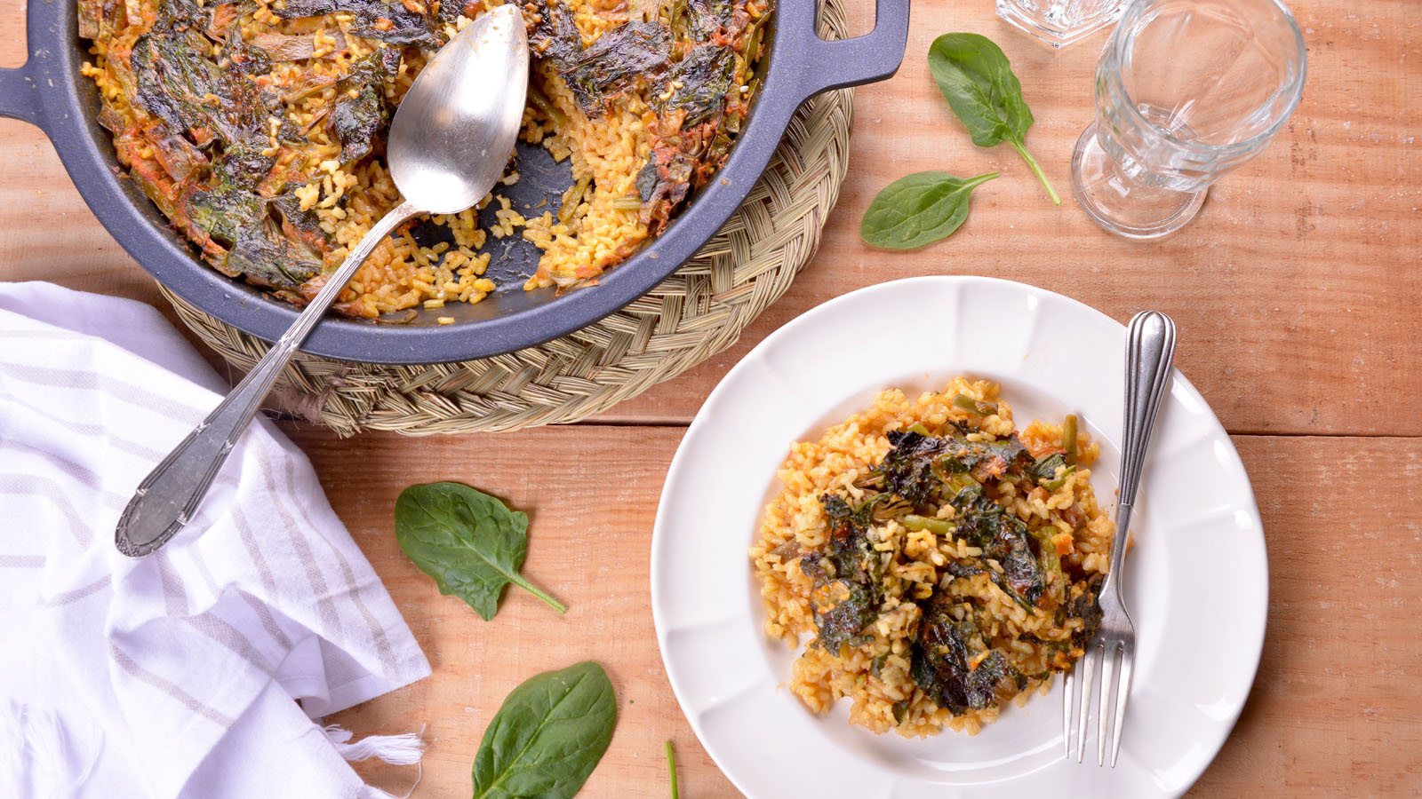En el capítulo 72 del programa de televisión Cocina de familia T4, la cocinera Elena Aymerich prepara una receta de Arroz de la huerta en costra.