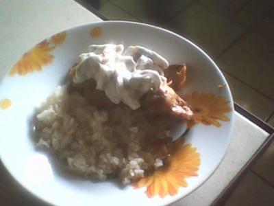 Se sirve una porción de arroz blanco, una pieza de pechuga cubierta de la salsa blanca de champiñones. (A gusto del comensal).