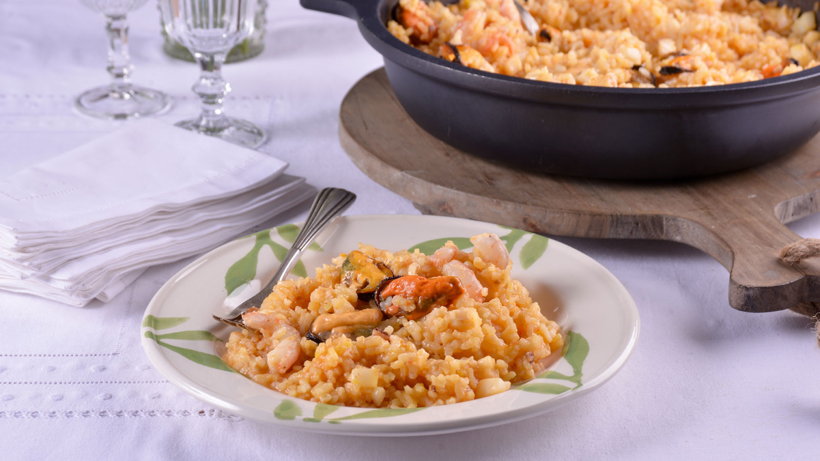 Para finalizar, añadimos los mejillones y los cuerpos de las gambas y servimos nuestro arroz meloso bien caliente. Las gambas se terminarán de cocinar con el calor residual de la sartén.