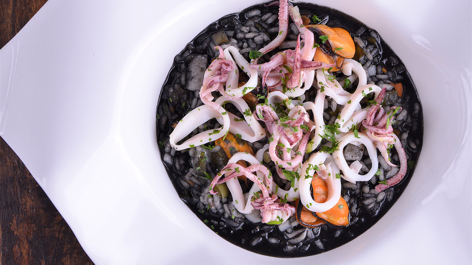 En ese mismo aceite freímos el pimiento cortado en brunoise, agregamos el arroz, salpimentamos y añadimos la tinta de calamar.