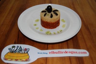 •Se coge un molde circular de presentación y se pone una capa de la mezcla de cordero, alisandolo bien con una cucharilla y encima una de couscous, que también aplanaremos con la cuchara. Quitamos el molde con cuidado y adornados con una aceituna negra cortada y un chorrito de aceite de oliva con perejil.