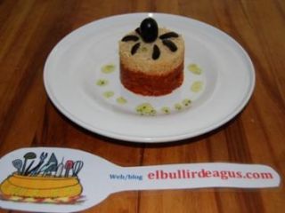 •Se coge un molde circular de presentación y se pone una capa de la mezcla de cordero, alisandolo bien con una cucharilla y encima una de couscous, que también aplanaremos con la cuchara. Quitamos el molde con cuidado y adornados con una aceituna negra cortada y un chorrito de aceite de oliva con perejil.