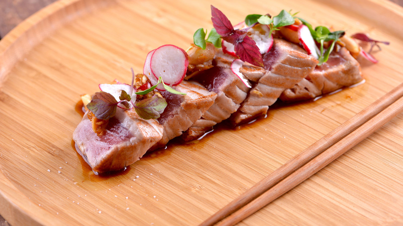 Servimos el atún fileteado y ponemos por encima la salsa de jengibre y decoramos con unas rodajas de rabanito y unos brotes.