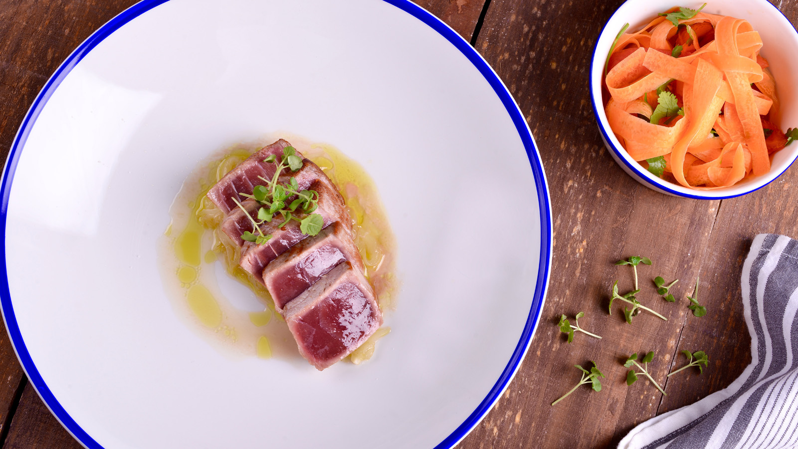 En el capítulo 611 del programa de televisión Cocinamos contigo T4, Sergio Fernández prepara la receta de Atún encebollado en tataki.