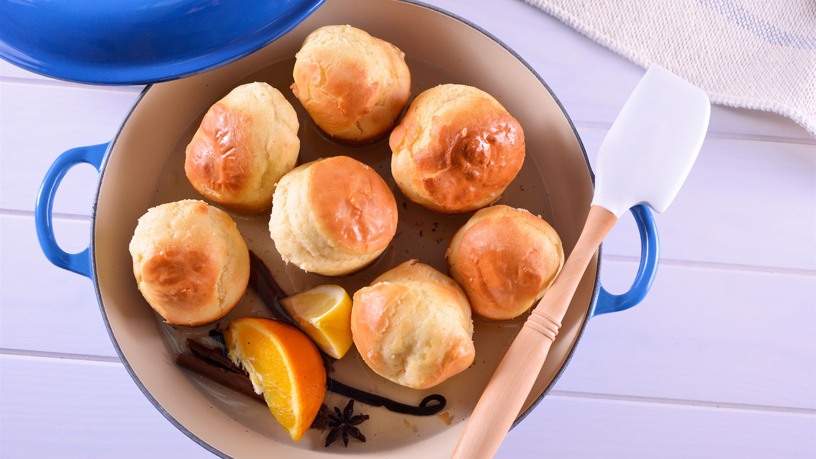 Mientras se hornean preparamos el almíbar, para ello ponemos en una cacerola el agua, el azúcar, el limón y la naranja troceados, las ramas de canela, la vaina de vainilla y la estrella de anís. Dejamos que se infusione bien.