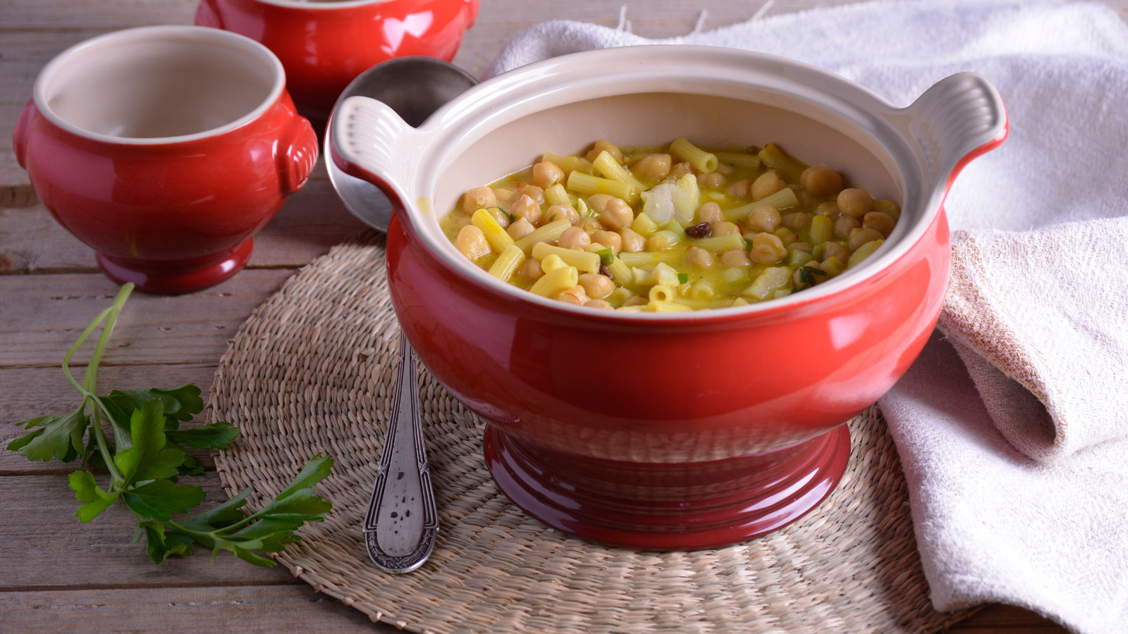 Cuando los macarrones estén al dente, añadimos el bacalao y el perejil a la olla de los garbanzos.