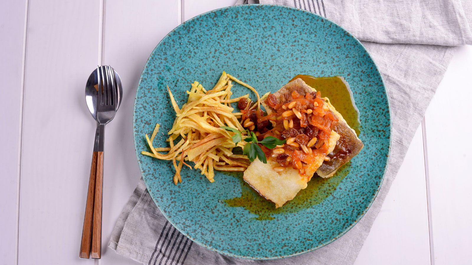Servimos las patatas paja, el bacalao y salseamos.