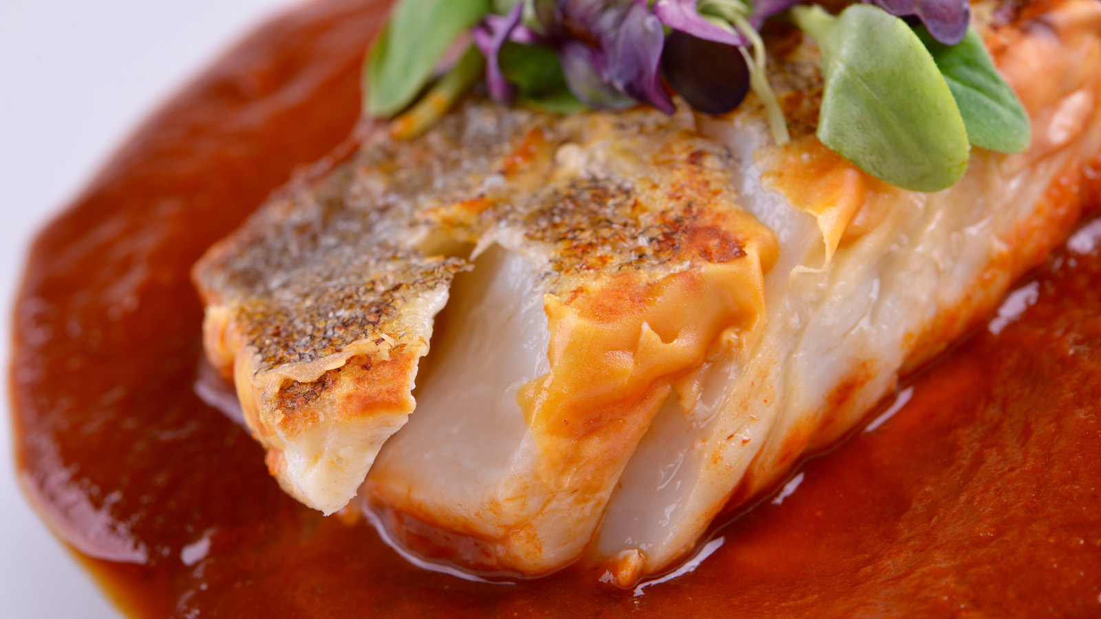 Hacemos el bacalao a la plancha, primero tostando la piel. Cuando le demos la vuelta incorporamos la salsa.