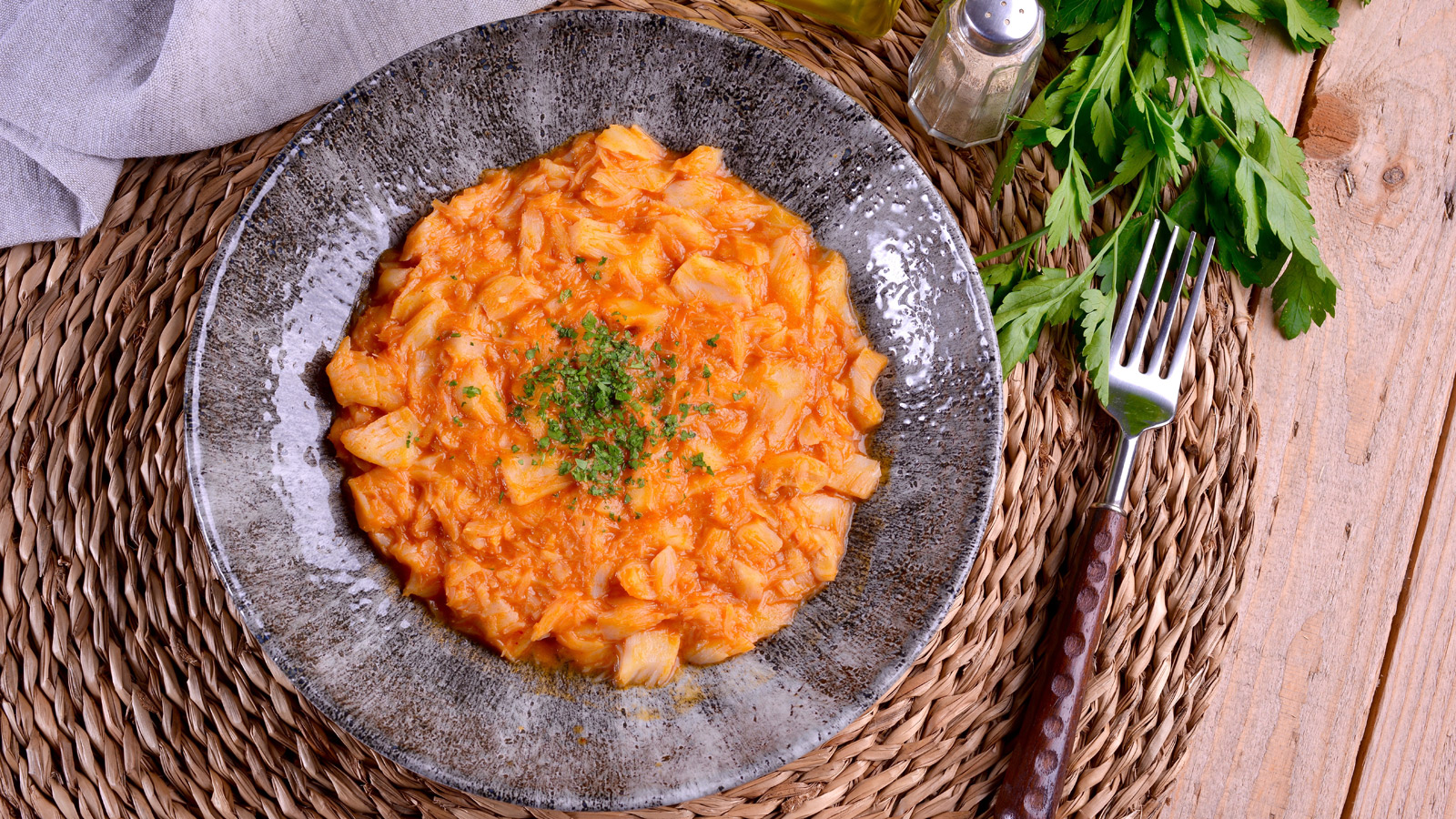 En el capítulo 15 del programa de televisión Sabor de Hogar, Juan Pozuelo prepara la receta de Bacalao a la vizcaína con pimiento choricero.