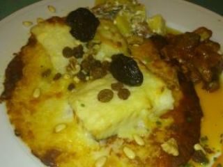 - SOFREIMOS EN CAZUELA DE BARRO CON EL ACEITE DE OLIVA LA CEBOLLA FINAMENTE PICADA,LE AÑADIMOS LAS ALMENDRAS TRITURADAS, LA NATA LIQUIDA POCO A POCO HASTA FORMAR UNA CREMA. SALPIMENTAMOS . COLOCAMOS LOS LOMOS DE BACALAO Y CUBRIMOS CON LA SALSA DE ALMENDRAS, ESPOLVOREAMOS CON PIÑONES, PASAS Y CIRUELAS Y LLEVAMOS A HORNO GRATINANDO PARA FORMAR LA COSTRA DE ALMENDRAS.