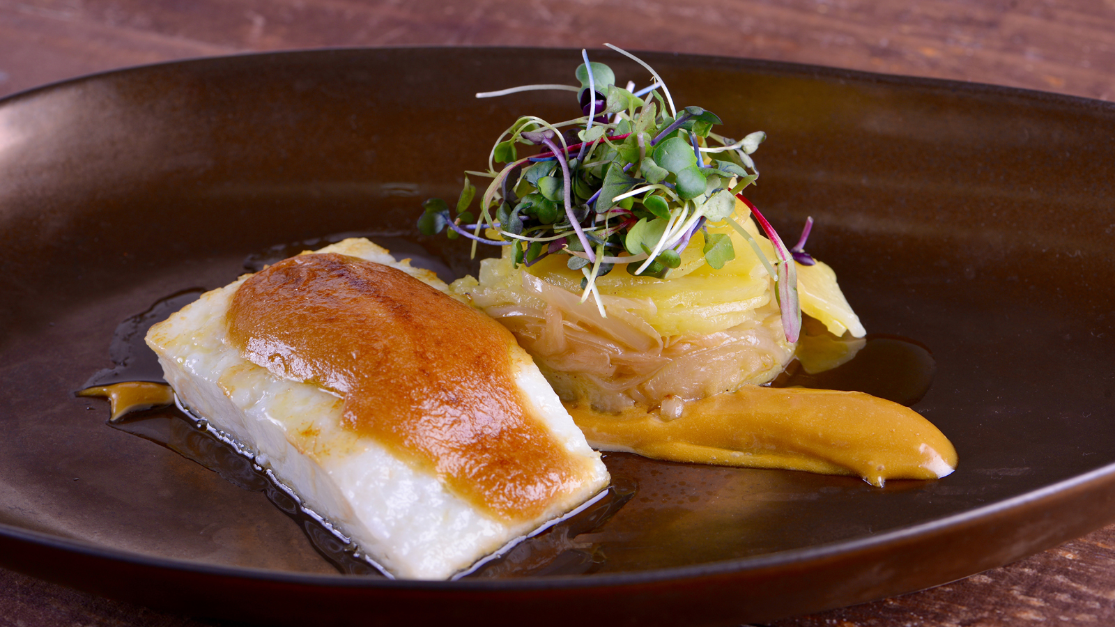 Servimos un poco de mahonesa, las patatas y el bacalao y decoramos con unos germinados.