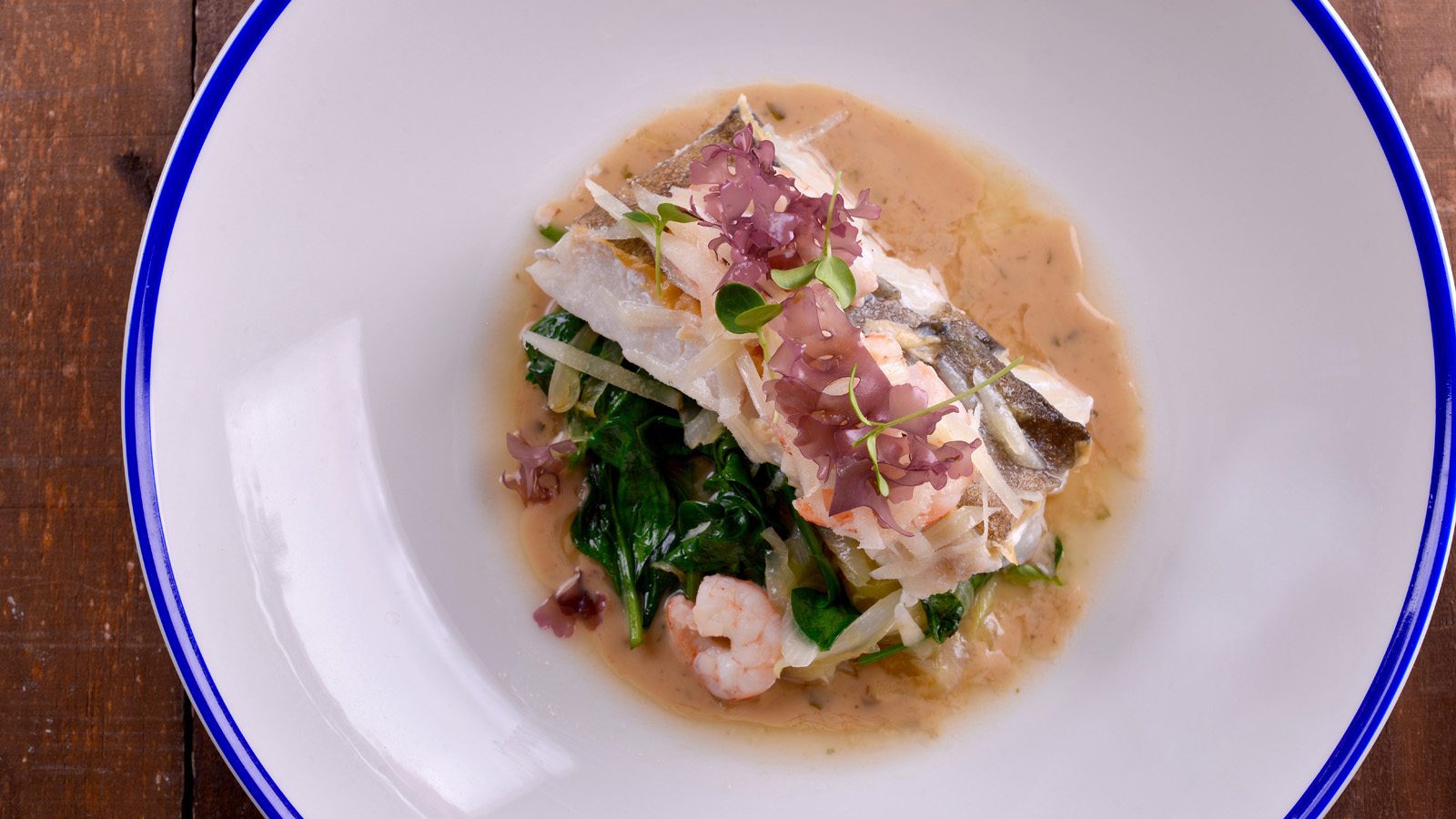 Servimos un poco de la velouté y colocamos encima la cebolla con las espinacas, el bacalao y las gambas.