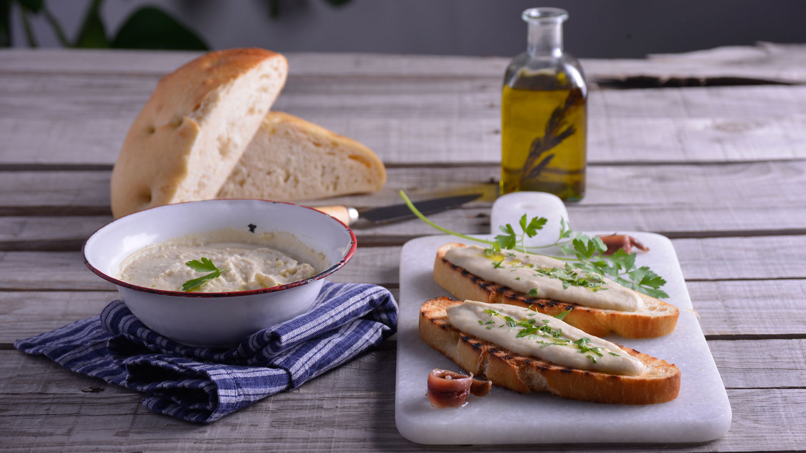 Emplatamos parte de la salsa en un cuenco y, el resto, la untamos sobre el pan. Coronamos espolvoreando perejil picado.