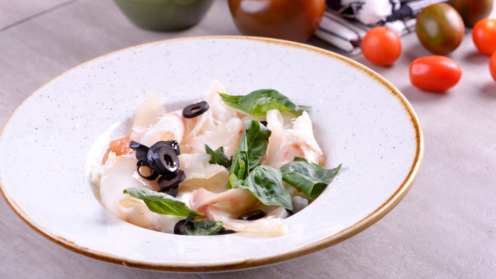Picamos aceitunas negras en aritos y ponemos en el fondo del plato el tomate rallado, encima el bacalao en pañuelitos, pellizcos de mozzarella, las hojas pequeñas de la albahaca y las aceitunas.