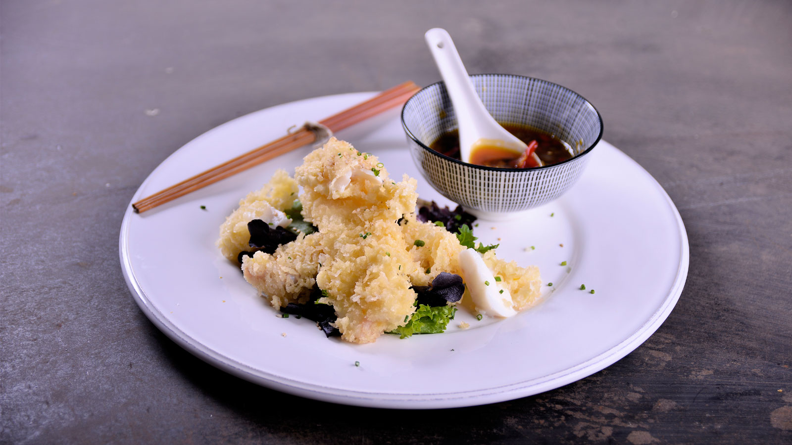 Servimos en un plato el bacalao rebozado acompañado con la salsa en un cuenco. Decoramos con el mezclum de lechugas, el cebollino picado y las semillas de sésamo.