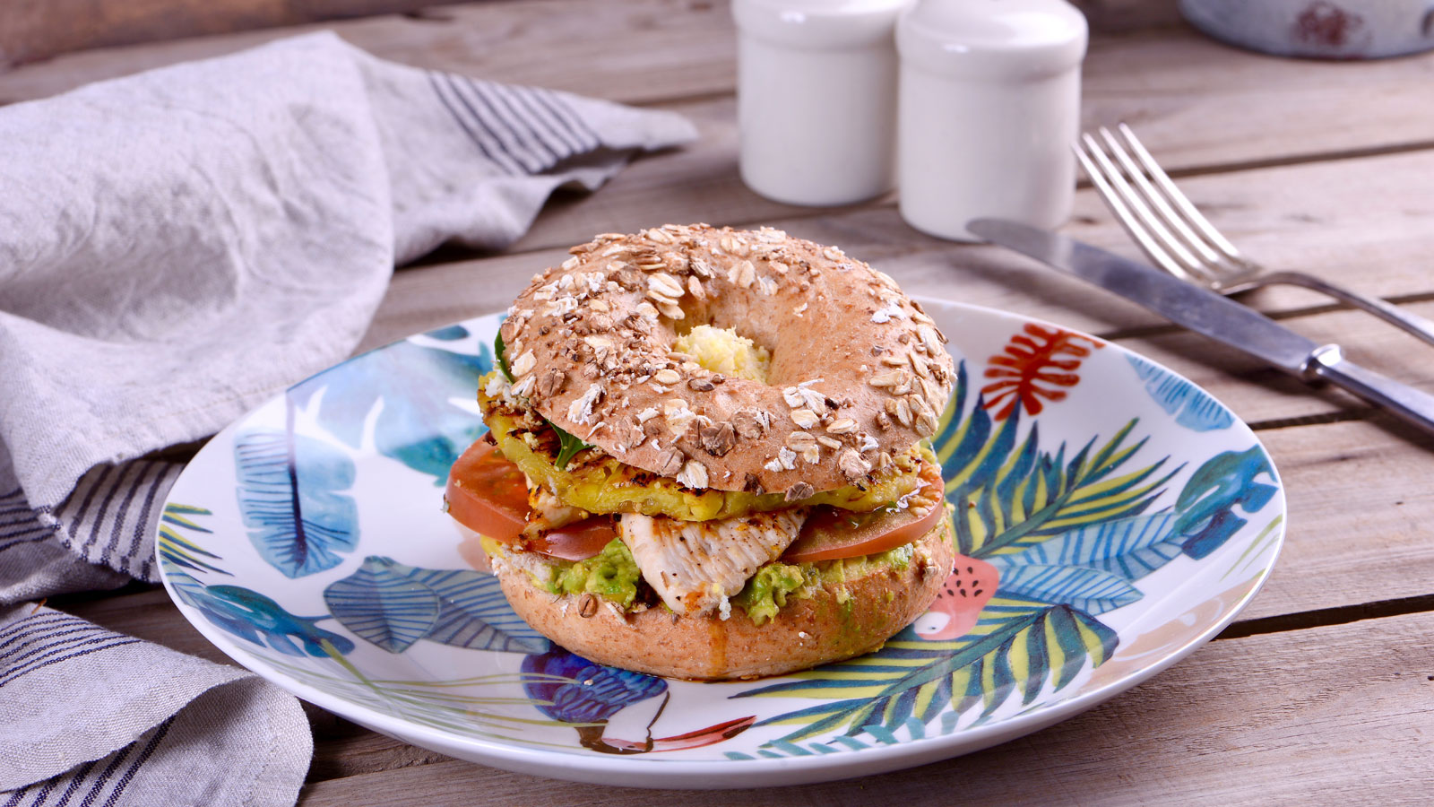 Montamos el bagel colocando una capa de tomate, otra de pollo, otra de piña y terminamos con el huevo rallado y la albahaca.