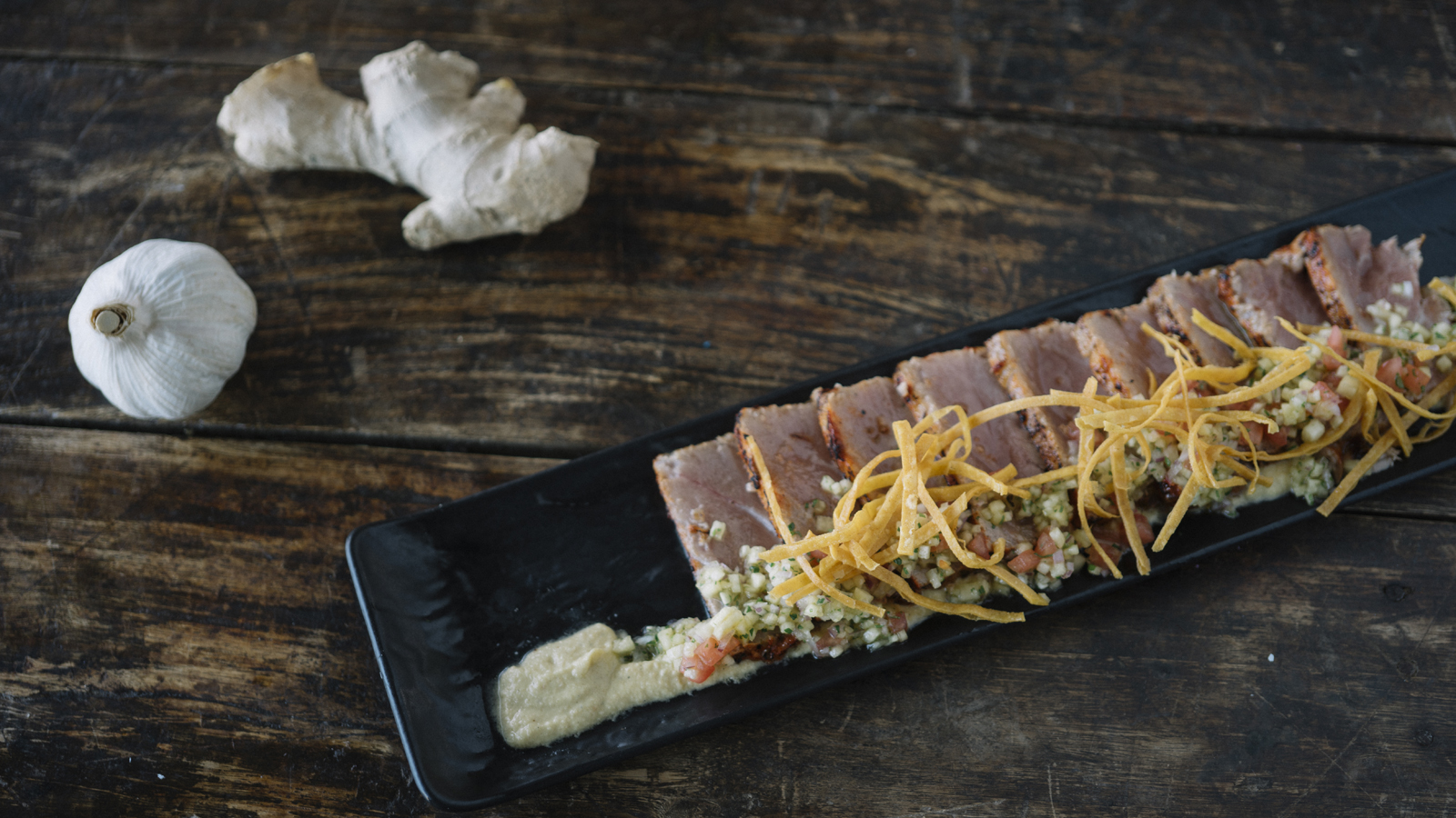 Servimos unas cucharadas de la salsa de piña, el atún fileteado, la vinagreta y terminamos con las tiras de las tortillas de maíz.