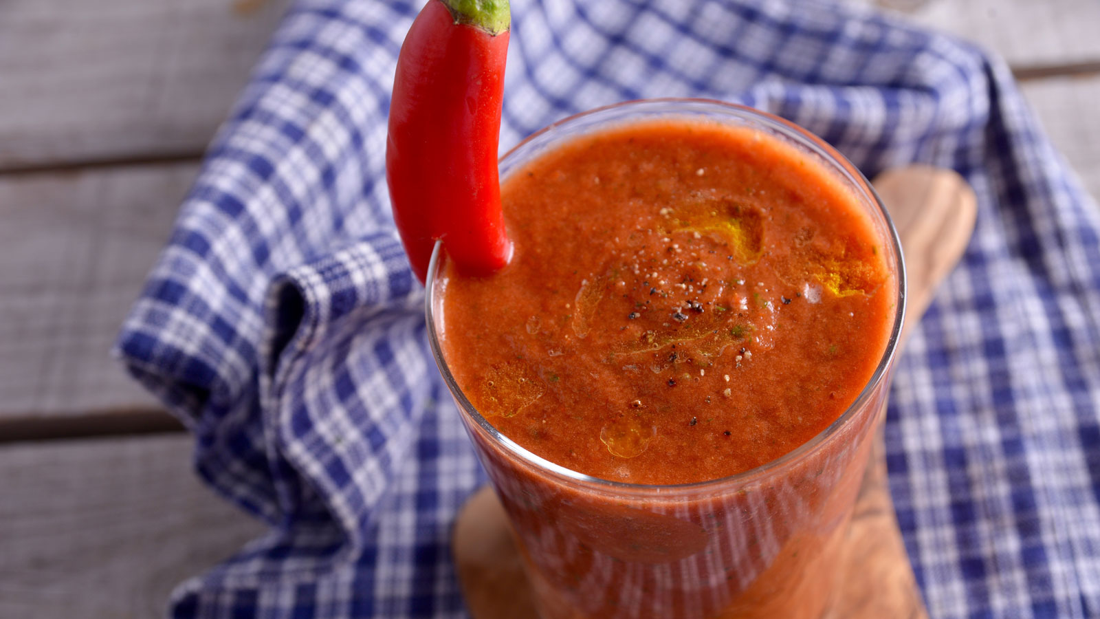 Trituramos hasta que todos los ingredientes se integren y lo vertemos sobre un vaso alto.